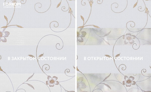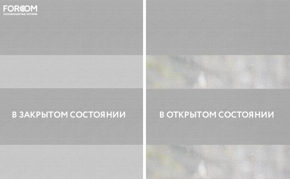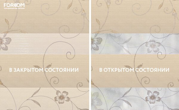 Полотно ткани, состоит из чередующихся горизонтальных полос – прозрачных и непрозрачных. Изменяя положение этих полос относительно друг другу, можно создать целых 3 режима регулировки светом. Например, чтобы в помещении стало светлее, нужно расположить прозрачные полосы друг напротив друга. Если разместить прозрачную и непрозрачную полосу параллельно друг другу, то можно добиться практически полного затемнения.